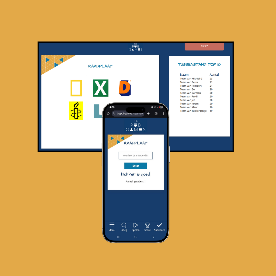 Sluit je laptop aan op een groot scherm en daag je groep uit met diverse digitale spelrondes. Ieder team of speler speelt mee met één smartphone en probeert sneller, slimmer en meer te raden dan de andere teams.